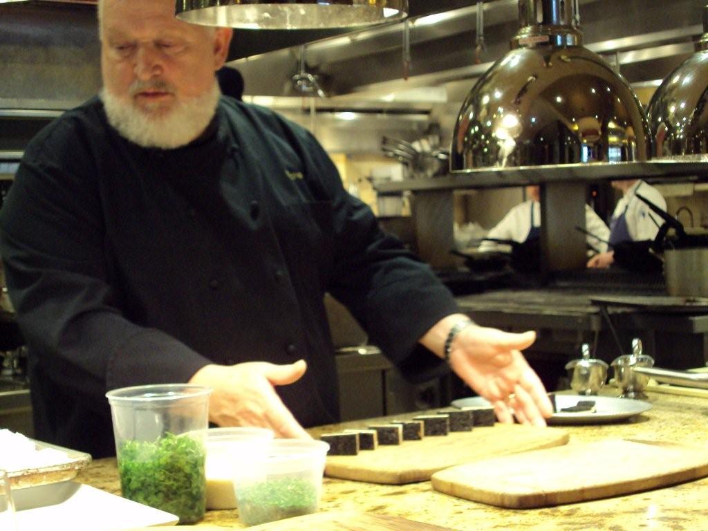 At the beginning of the event, I was (intentionally) positioned to watch Michel make some “small bites,” which he handed to the three of us. At one point, Michel was in the corner of the room surrounded by his staff. I wandered over into his tight group and started a conversation with him. I’d never met Michel before and was very impressed with him because he is personable, passionate, and expressive and makes people immediately feel comfortable. He is also funny: (spoken in a French accent) “I like cheeses that smell like my feet when my wife gives me foot rubs.”