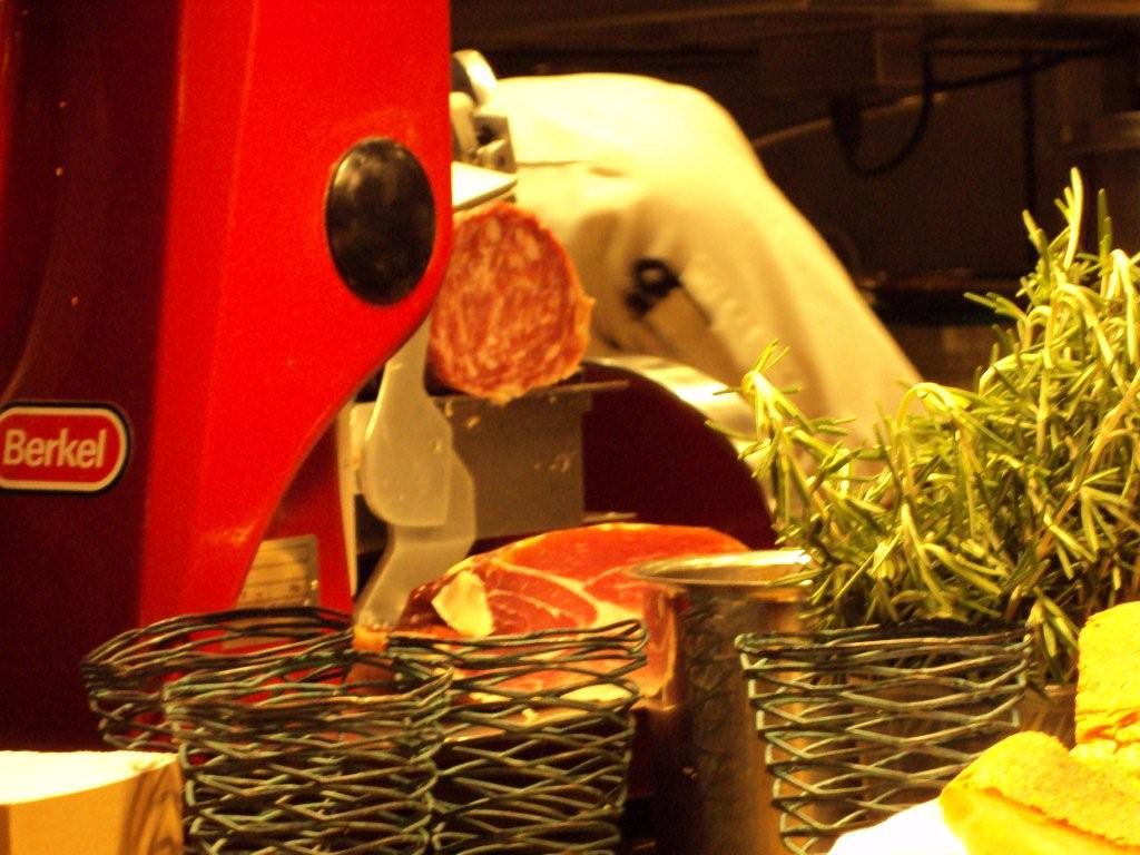 Half of the time my gaze kept being drawn back to their house made charcuterie–intensely red cured hams, and salamis sitting right in front of me on the meat slicers. $22 for a charcuterie plate (from their lunch menu).