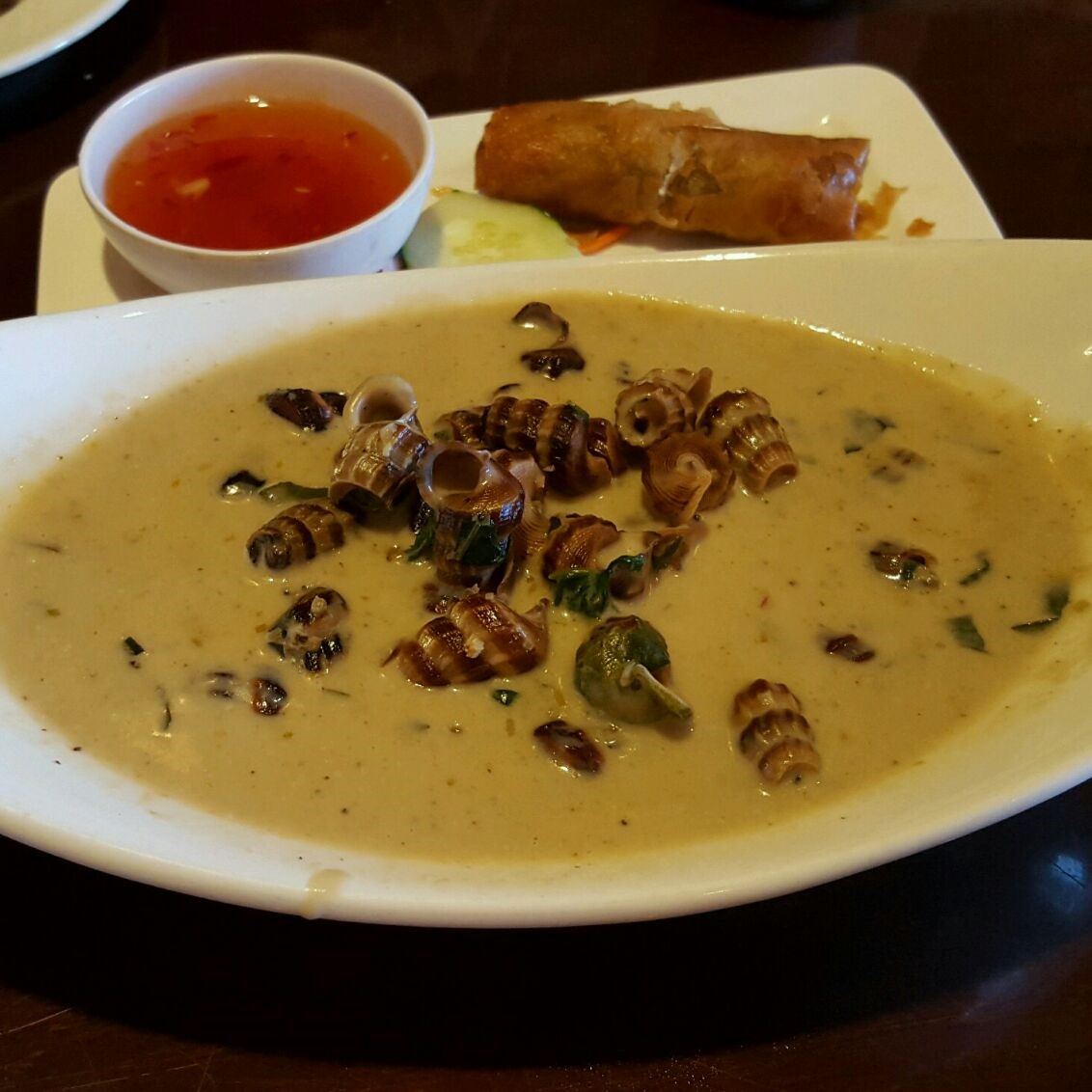 Our spring rolls came out with the Oc Len Xoa Dua, the escargot dish that seems to get much traffic via the pictures on Yelp, but was my least favorite dish. To me it seemed like a bowl of very small snails in a light curry sauce that reminded me of bland Thai food. The small escargot needed to be sucked out of its shells…which would have made for a fun experience if they didn’t fight so hard to stay inside their swirly homes. At one point I asked my husband if they might still be alive. What did come out seemed like a slimy mess. I love succulent briny oysters and soft juicy French escargots in butter and garlic, but this was not that. In addition, the dish was 90% coconut curry and could have benefitted from some accompanying sticky rice.