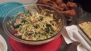 One of the side dishes was “Ma’s Slaw,” which was a vinaigrette-based coleslaw. Now, never having made coleslaw before, the preconception is that the dressing is mayonnaise-based. However, the apple cider vinaigrette dressing was unique, and a really nice change of pace. It was a hit, as everyone loved the sweet, tart flavor absorbed into the fresh cabbage.