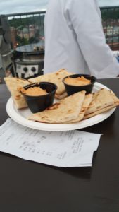 Starters: Roast Piquillo pepper hummus, Street Fare Kabobs Skewers of beef, chicken, steak, and vegetables, and Grilled Wings, which all will run you about $10.