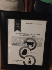 They presented their version of “Steak and Potatoes” with hanger steak and potato from with a dehydrated version of A-1 shot. Quickstep used vacuum sealing and a precise water bath powered by a car battery. The potatoes were inserted a NO2 canister which produced a whipped, smooth effect. Along with the dehydrated A-1 shot, they used natural ingredients that are commonly found in the sauce.