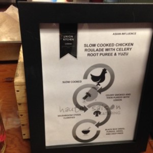 This offering was a “pho-like” without the noodles, said by Sam Williams, one of the attendees. This slow cooked chicken roulade with celery root puree and yuzu was prepared by chefs that wanted to put an Asian influenced dish forward. The cooking method used innovative technology; celery was smoked and then purified with lemon and a clarified mushroom stock. Dried black rice which was then pureed, dried, and deep fried for a crunch element and added to the dish.