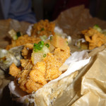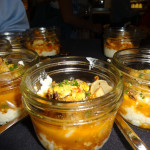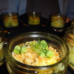 This offering was a “pho-like” without the noodles, said by Sam Williams, one of the attendees. This slow cooked chicken roulade with celery root puree and yuzu was prepared by chefs that wanted to put an Asian influenced dish forward. The cooking method used innovative technology; celery was smoked and then purified with lemon and a clarified mushroom stock. Dried black rice which was then pureed, dried, and deep fried for a crunch element and added to the dish.