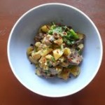 The main thing I’ve learned is that purging is absolutely essential: the final product is much less greasy and grainy, with better flavor. Purging goes like this: you slice the eggplant, salt it pretty generously on both sides, and leave it in colander for just over an hour. The salt draws out some of the moisture from the outside layer, making it firmer and sealing the insides. Then, you rinse the eggplant (very well, you don’t want all that salt in your dish), and dry them with paper towels (I squeeze them a bit to be sure). Then cook them. This is especially critical if you’re frying, but important in other prep too, for eggplants. Also works on plantains, tomatoes, etc.