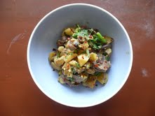 While the eggplant is purging, grease a tray with some oil, and make a dressing from the garlic, herbs, cayenne, and about a tablespoon of oil. Preheat your oven to 425. I actually made this in my toaster oven, because it’s bloody hot these days and I wanted to minimize the heat in my kitchen.