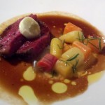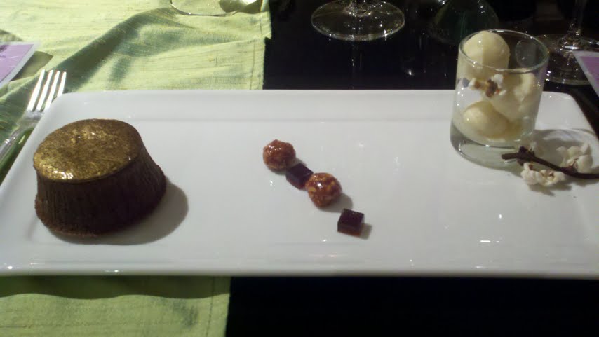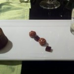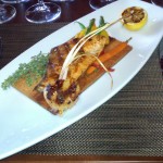 The cedar plank roasted organic salmon and lemongrass sea scallop (with asparagus, carrot, and golden beet) was one of my favorite dishes. The scallop was good but I adored the salmon, so am including the restaurant’s cedar plank roasted salmon recipe below. I liked the golden beet (and the asparagus was fine) but the carrot (flavor and texture) didn’t do anything for me. The dish was served with Mer Soleil Chardonnay (Central Coast 2008). While I do not enjoy “oaked” chardonnay, I disliked this one less than others I have tried, since I could taste a strong caramel note. We were given a tip for plank grilling: soak and oil the plank so that the plank doesn’t burn or leach the moisture from the fish.