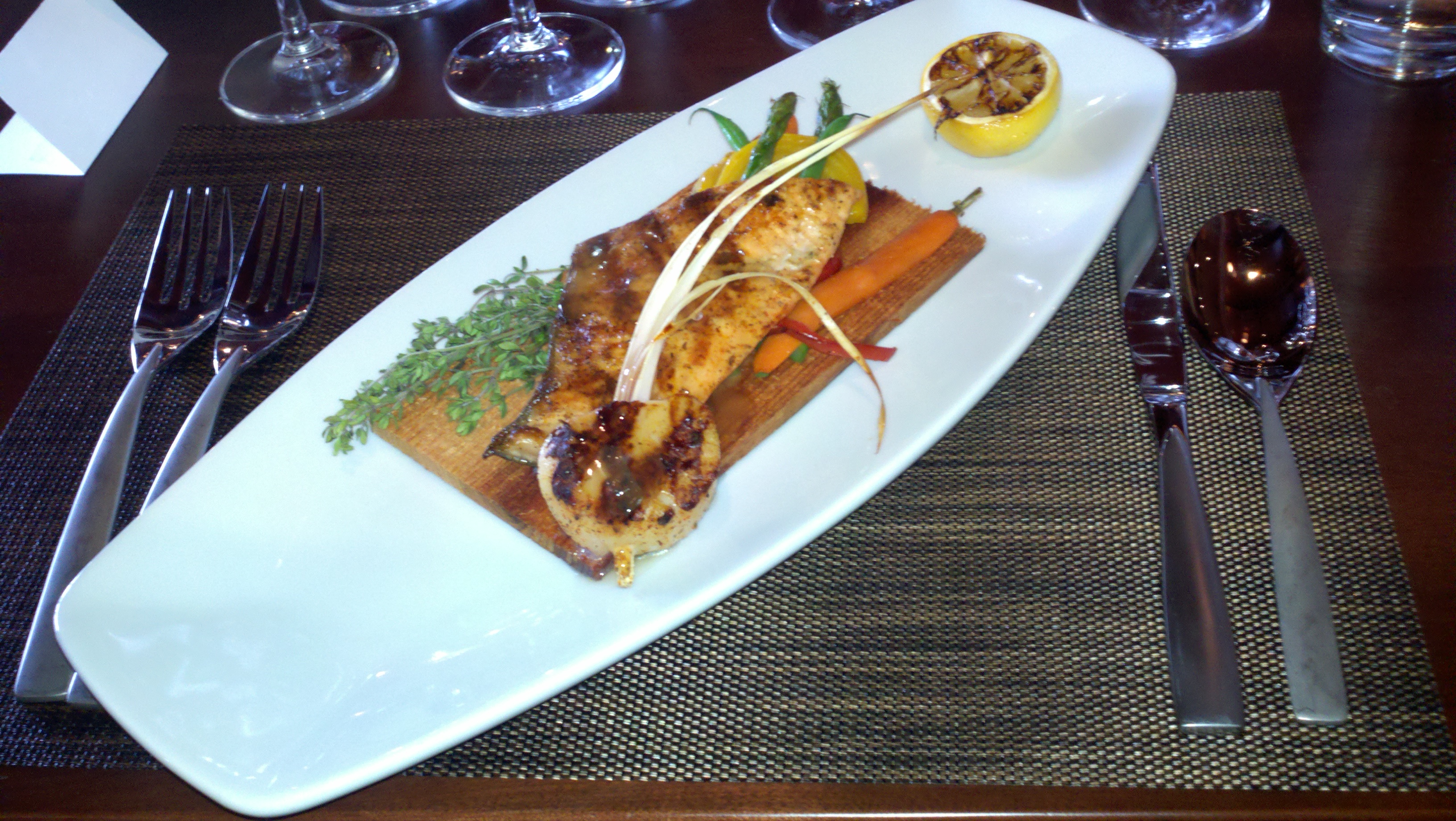 Pic by me. Cedar plank roasted salmon and scallop.