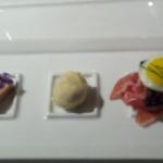 The mesquite-grilled lamb t-bone chop and Manchester Farms quail breast with mashed sweet potatoes and bourbon-chili glaze was really a combination of two entrees served as one large appetizer. It was paired with the Markham Petite Sirah (Napa 2004) and De Toren Fusion V (Stellenbosch 2007); we were told to see which of the wines we liked better with the two proteins. I liked both wines with the lamb but preferred the full-bodied fruity flavor of the Markham (while Anita preferred the Fusion V). I am not a wine specialist but I felt that both wines competed too heavily with the flavor of the quail; it probably isn’t easy to pair two red wines with two very different proteins. The mashed sweet potatoes were very good and went well with both proteins.