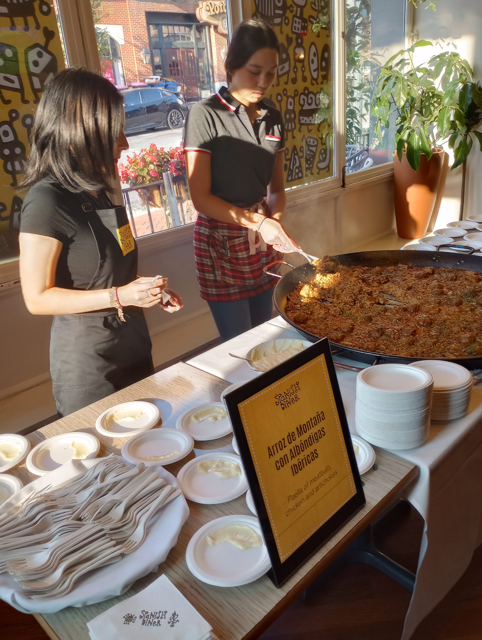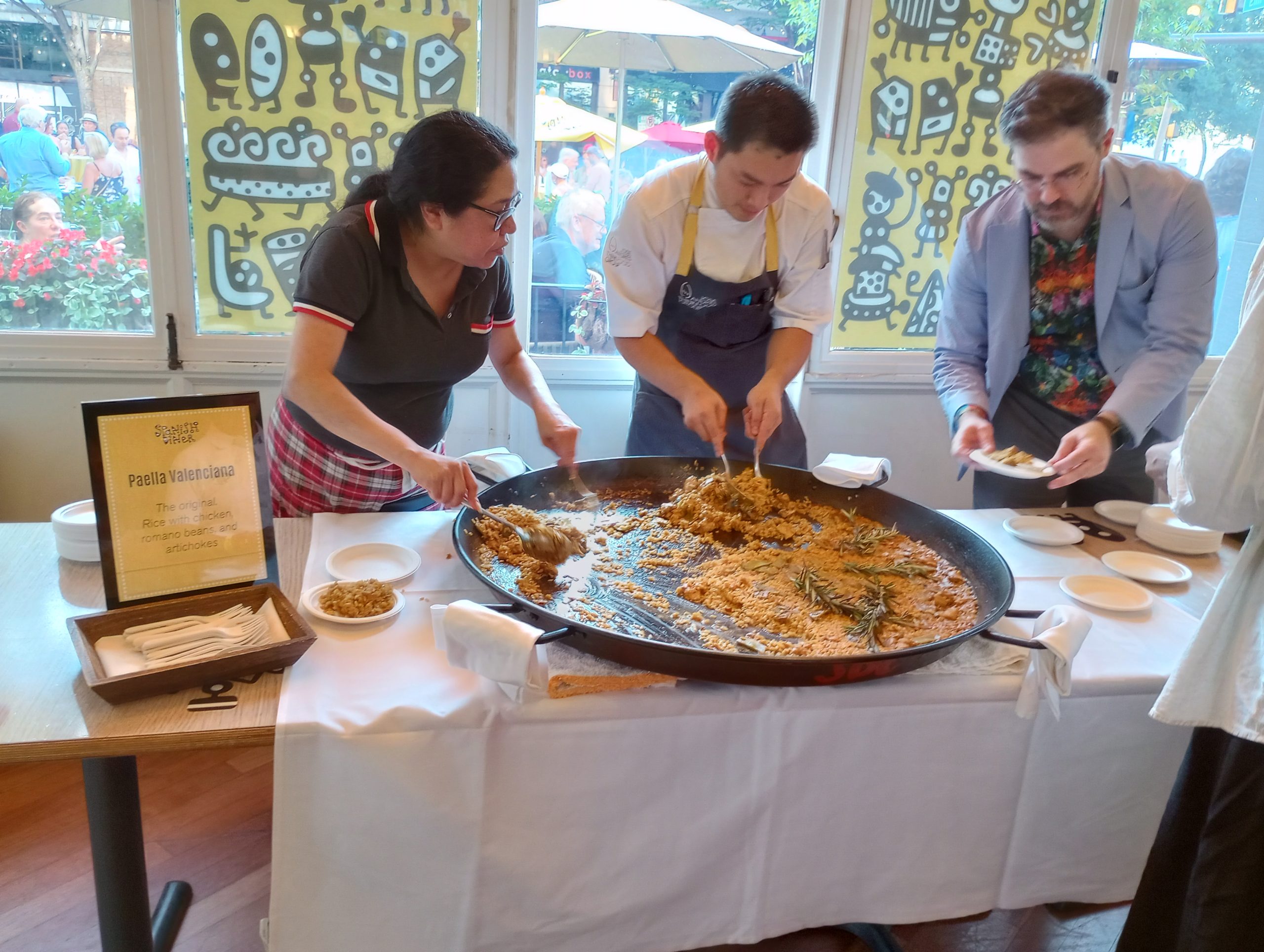 We attended the Paella Fest Kick-Off Party at Jose Andres’ Spanish Diner in Bethesda yesterday. This was to kick-off to its annual, two-week celebration of paella (9/19-10/2). Chef Daniel Lugo cooked shrimp paella outside in front of guests. The other paellas were brought from the kitchen already prepared. Tapas, wine, and sangria were also served; the white sangria was a big hit (and was fizzy).