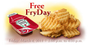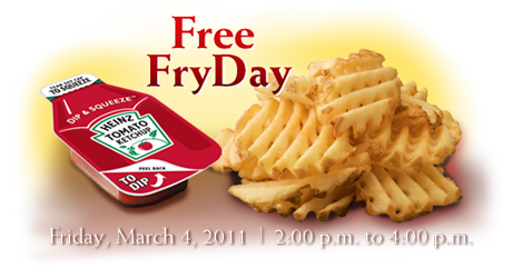 In celebration of the national availability of Heinz® Dip & Squeeze® Ketchup, March 4, 2011 is being declared FREE FryDay at Chick-fil-A® restaurants nationwide. Between 2 and 4 pm local time, ketchup lovers who ask for Heinz Dip & Squeeze at all Chick-fil-A restaurants will receive a FREE medium order of Chick-fil-A Waffle Potato Fries®, limit one per customer.