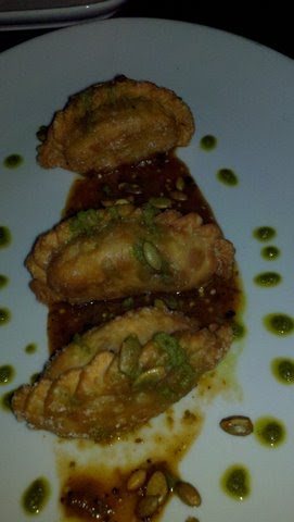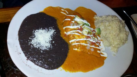 I ordered a margarita with one of their better tequilas (for an added $2 to the regular price) and it was well worth the upgrade. The guacamole and vegetable empanadas (camote, acorn squash, Oaxaca cheese, epezote oil) were both very good. The Chicken Zarape (bacon, panela cheese, cotija cheese, pico de gallo, chipotle sauce, crema fresca, refried beans, and creamy white rice) was tasty and seemed like a complete platter (unlike some of their other dishes that are more like one pot meals yet feel to me like they should be served with side dishes).