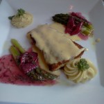 The salmon was cooked nicely and I liked the pepita crust, although I had to add a touch of salt to get the flavor to pop. I wasn’t a huge fan of the sauces they drizzled on top – they tasted like they were made with store-bought mayo. The ragout was okay. Or maybe weird is the word I’m looking for. It had potatoes in it, which I found unnecessary for the dish. I was actually confused by the potatoes. John disagreed and thought the potatoes were a nice addition. /shrug. He got pan-roasted rockfish with a citrus sauce, which was also cooked nicely. It came with asparagus in a blood orange sauce, and fancy blobs (rosettes?) of what tasted like a celery root puree. I couldn’t try the rockfish because of gluten issues, but John assured me that it was very delicious.