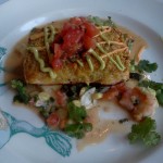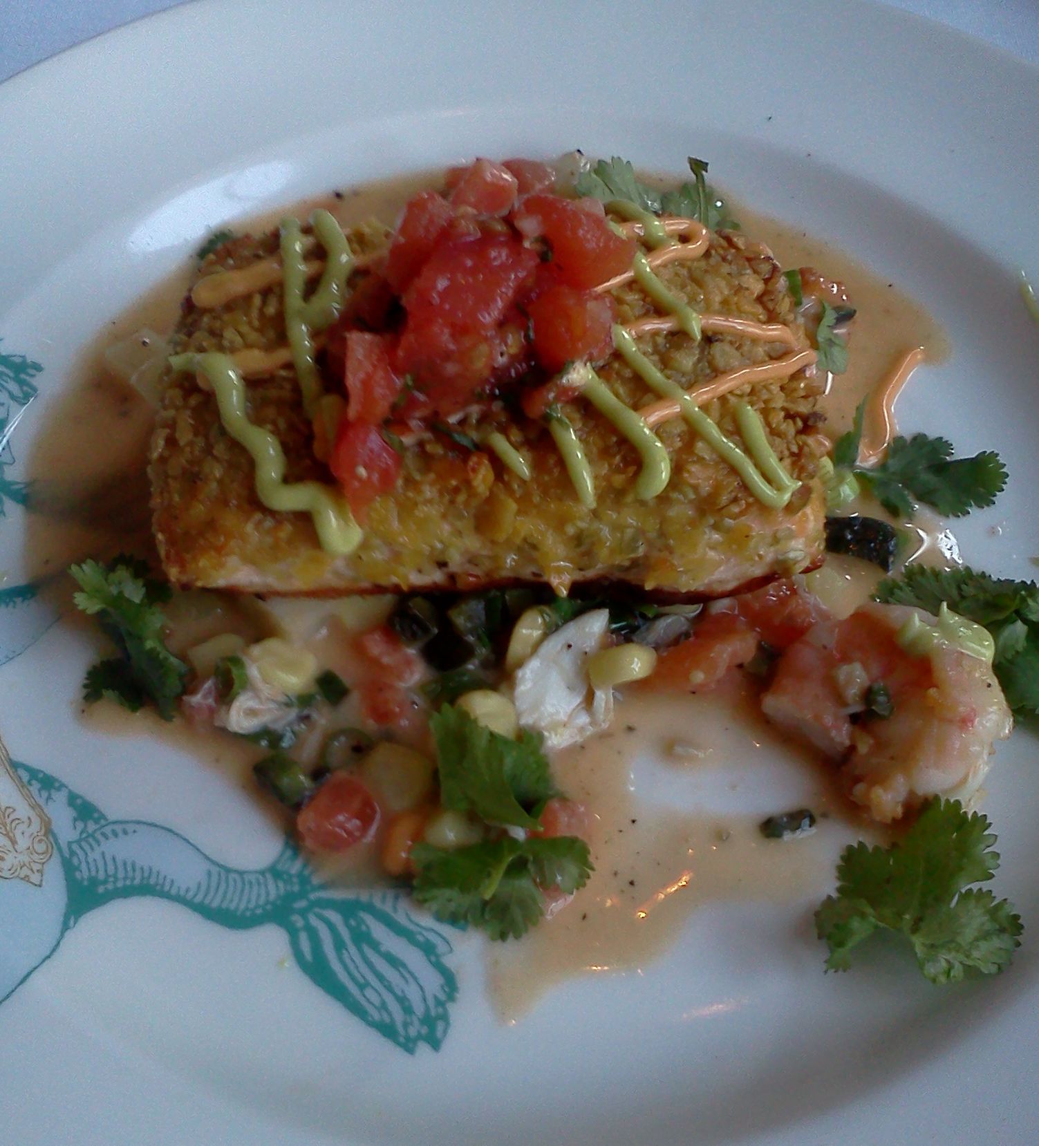 My Pepita Crusted Salmon with Cilantro, Chiles, Crab, Shrimp and Corn Ragout came out a few minutes later.