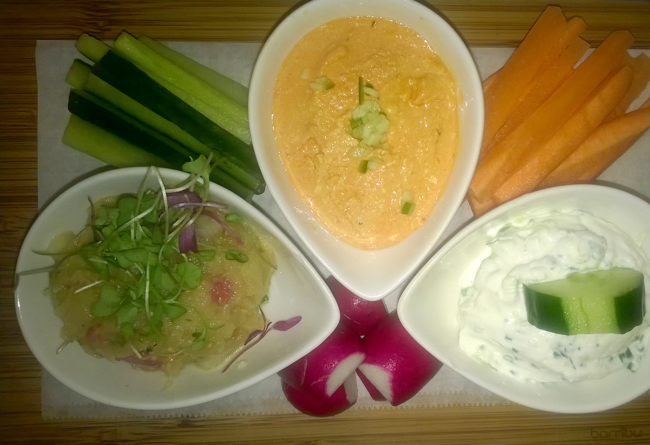Dip Trifecta: Melitzanosalata, Htipiti, and Tzatziki (left to right)