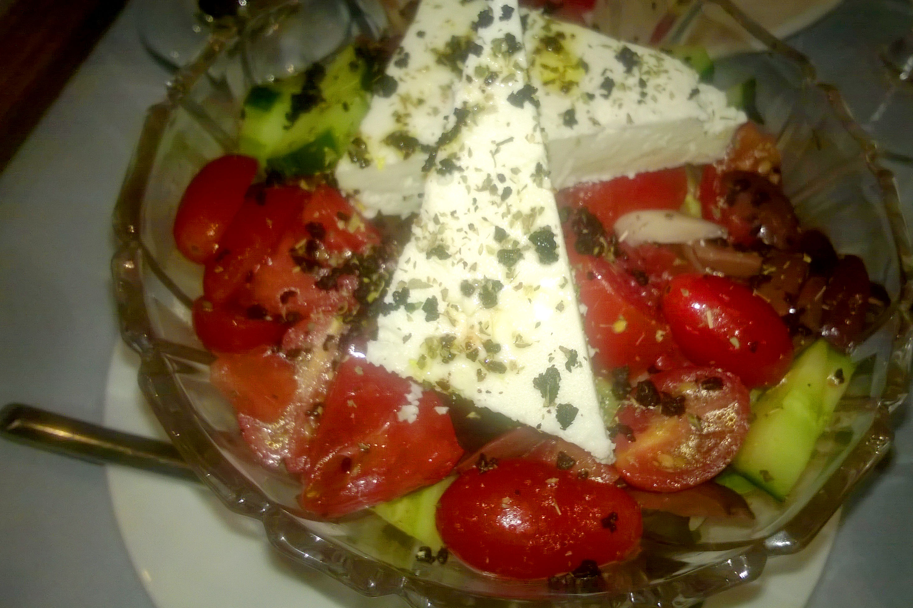 Look at those sublime chunks of feta, lounging on ripe red tomatoes, Kalamata olives, and cucumbers! Feta cheeses are all salty, but this one was relatively mild and not super tangy. Lightly dressed and perfectly herbed, it made for a refreshing, delightful salad. Dried olive was sprinkled atop it to compliment the brined olives underneath. I suggest crumbling the feta and mixing it a bit before serving. Again, note the care put into the food: because it came unmixed, it’s a hint that the salad was made-to-order and wasn’t pre-mixed hours ago in the kitchen.