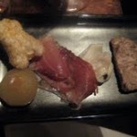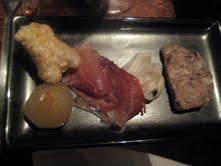 The next course, a “tasting of pork,” is a plate of porcine delicacies accompanied by foccaccia studded with pancetta and taleggio. The plate includes testa (the Italian word for head) with mustard and dill—a pate like creation that Stefanelli made with pork jowl, as well as a few other delicious pork cuts: culatello, speck, lardo, pork crackling, and a pickled cippolini onion.