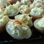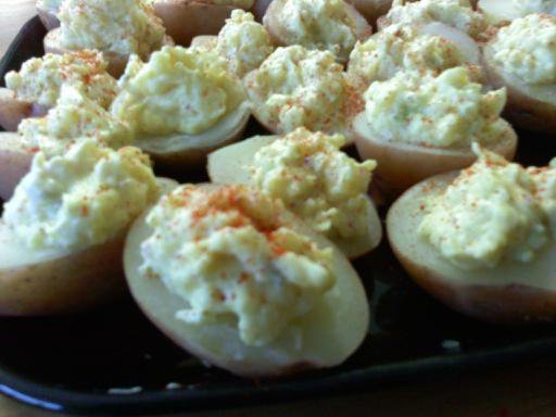 Boil potatoes in a sauce pan until tender. Drain and let cool. Carefully slice in half and with a melon baller or a measuring spoon and gently scoop out the space for the “yolk”. I just make 1 small round scoop near one end.