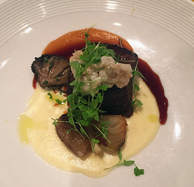 The chef at RIS graced us with new creation that would make any vegetarian smile with delight. A crown of cauliflower served over spaghetti squash, Du Puy lentils, Greek yogurt and dotted with pomegranate seeds, raisins, pine nuts and mint – it was heavenly! I would have been happy to have made this gem of a creation both my first and second courses.