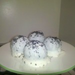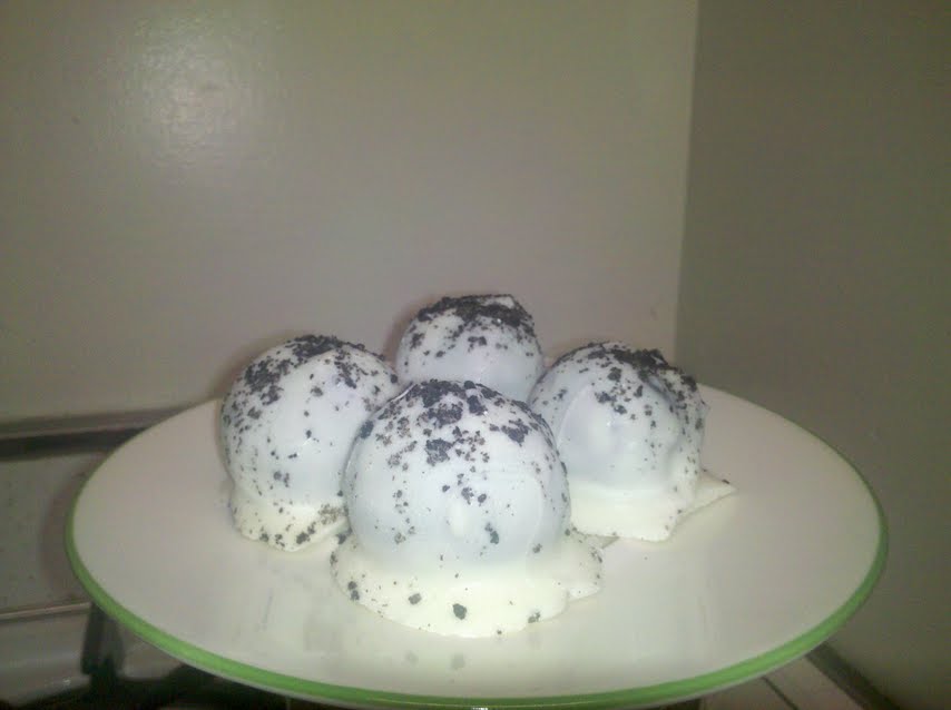 The beauty of these is that they can be frozen (I’ve had them in the freezer for nearly two months) and customized. I believe the original recipe uses actual cake (in place of the cookies, bake a sheet cake according to the directions on the box, let it cool, crumble, add cream cheese, etc.), so different types of cake or chips can be used. Favorites so far have been peanut butter chips coating peanut butter Oreos, white chocolate chips coating lemon cake (with a little lemon extract added), and white chocolate chips coating red velvet cake. They can even be made using reduced fat Oreos and fat free cream cheese with no noticeable taste difference. As for decorations on the top, you can melt a few dark or milk chocolate chips and drizzle over the white chocolate or peanut butter coatings. I was planning on making white chocolate-peppermint coating for the holidays, but apparently peppermint extract in Arlington is hard to come by. The world is your oyster, so be creative and enjoy!